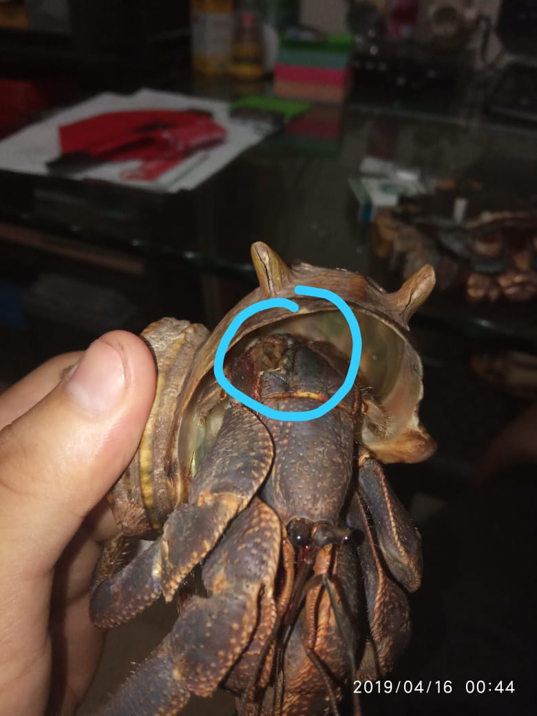 Years and years keeping hermit crab, this is the first time I see something like this. Is it what I think it is? I do not want to harm and risk my family with a parasitic worm that may be able to infect human. Or is it just an open wound that exposed its muscle? Ladies and gentlemen, do you have any pieces of information about it? Even a chunk will come in handy... I really need it at the moment, Thanks!